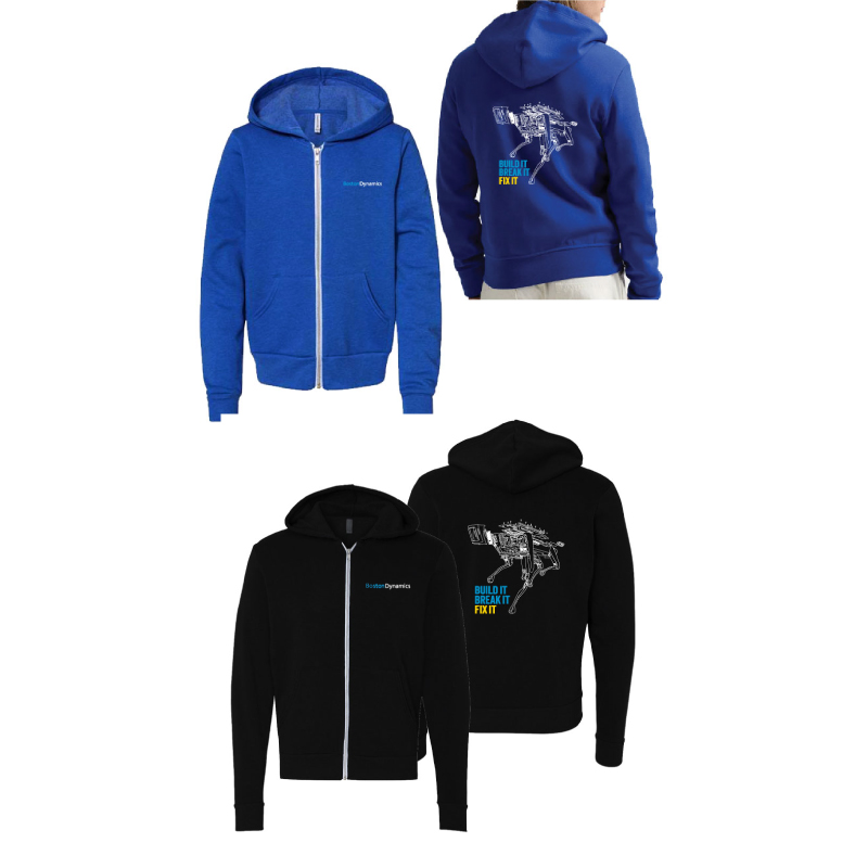 Because you demanded it, we've introduced a Youth version of our Spot Innovation Full Zip Hoodie! At Boston Dynamics, we’re always innovating and pushing the limits of robotics. This illustrated Spot full zip hoodie features the many parts and pieces it takes to build a successful robot, with the inspiring phrase “Build it, break it, fix it.” Printed full back with the Boston Dynamics wordmark on the left front chest, this Bella+Canvas hoodie is made with 8-ounce, 52/48 Airlume combed and ring spun cotton/poly fleece.