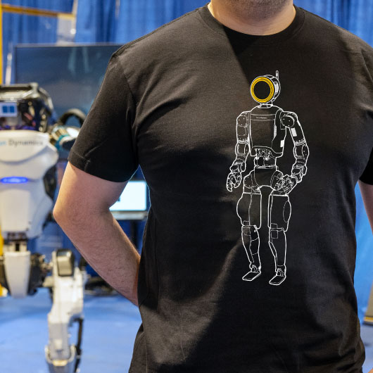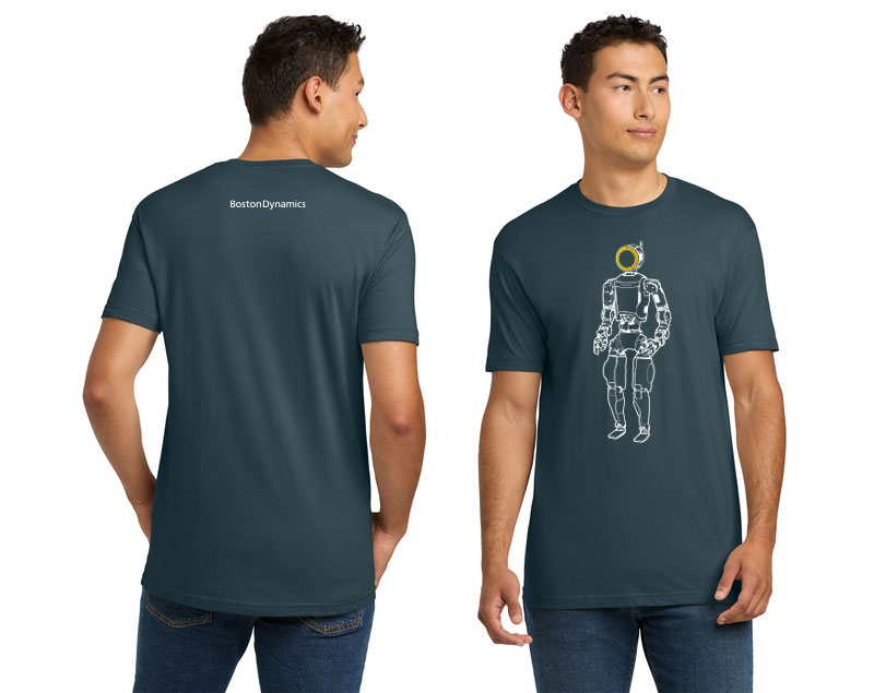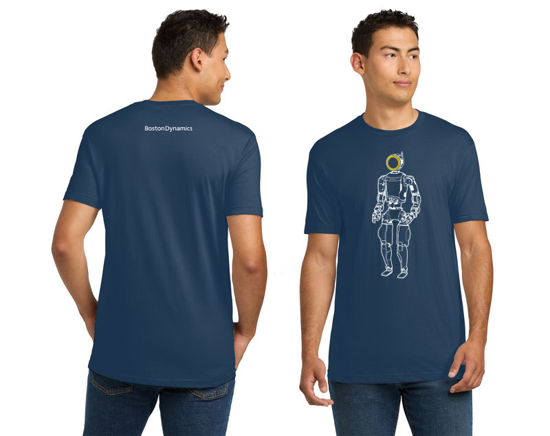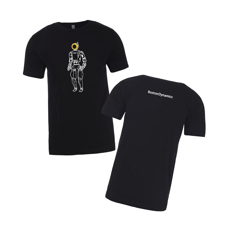 This new t-shirt features an illutration of our next generation all-electric Atlas. Printed full front with the Boston Dynamics wordmark on the upper back, this tee is made with premium 100% combed ringspun cotton. The Next Level brand tee is soft and has a retail fit.